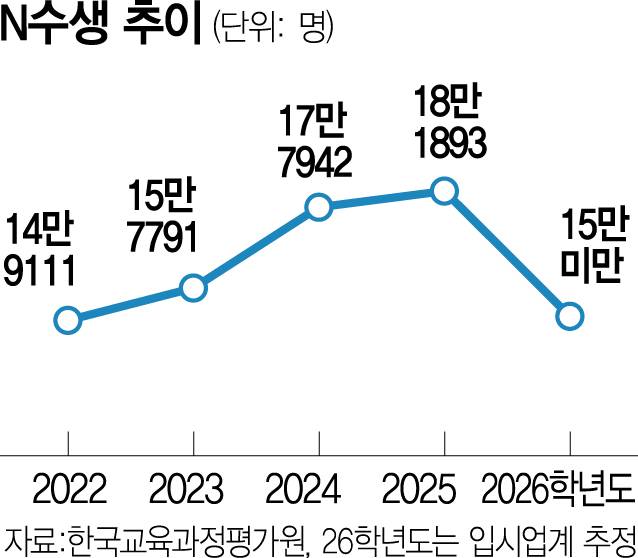 입시업계 관계자는 "메가스터디 등 3개 학원의 N수생 등록률이 전년과 비교해 20% 가량 줄어들었는데, 의대 모집인원이 동결될 것으로 예상하고 의대 진학을 포기한 학생이 증가한 영향이 크다"며 "올해 수능 응시생 수도 등록률 감소 폭 만큼 줄어들 수 있다”고 전망했다. 2025학년도 수능 응시 N수생이 18만 1893명인 점을 감안하면 2026학년도엔 15만 명 밑으로 떨어질 수 있다는 것이다.