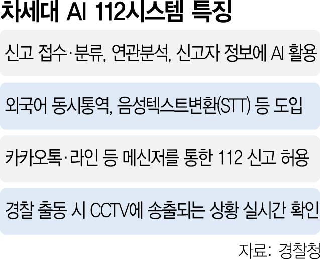 경찰이 112 시스템에 인공지능(AI)을 도입해 신고 접수 직후 피해자의 기존 신고 내역 및 유력 가해자 등을 파악할 수 있는 방안을 마련한다. 다문화 가정 확대와 각종 소셜네트워크서비스(SNS) 발전에 발맞춰 AI 기반 외국어 통역시스템을 도입하는 한편 카카오톡, 라인 등 메신저로도 신고가 가능토록 할 방침이다. 현장 출동 직후에는 인근에 설치된 AI 폐쇄회로텔레비전(CCTV)을 활용, 신고자 주변 환경을 실시간 영상으로 확인할 수 있도록 해 현장 대응력을 제고한다.