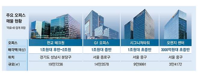 몸값이 1조원이 넘는 매물로는 판교 테크원, 시그니쳐타워, G1 오피스 등이 꼽힌다.