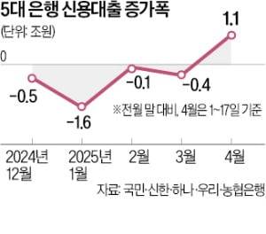 이달 가계대출 급증세를 이끈 것은 신용대출이다. 5대 은행의 신용대출은 이달 1~17일에만 1조596억원(1.0%) 늘었다. 신용대출은 작년 12월부터 올 3월까지 4개월 연속 전월 대비 감소했는데 이달 들어선 급증세를 보이고 있다.