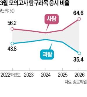 탐구에선 사회탐구 응시율이 64.6%로 2022학년도 통합수능 도입 이후 최고치를 기록했다. 3월 학력평가 연도별 사탐 응시율은 2022학년도 56.2%, 2023학년도 54.7%, 2024학년도 52.8%, 2025학년도 55.1%, 2026학년도 64.6% 등이다. 사탐 응시율이 늘어난 것은 문과생 증가와 함께 이과생이 사탐을 응시하는 이른바 ‘사탐런’ 현상도 두드러지고 있기 때문이다. 2024학년도에 47.2%까지 치솟았던 과탐 응시율은 35.4%로 떨어졌다.