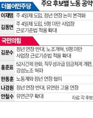 '6·3 조기대선'을 앞두고 주 4일 또는 4.5일제, 정년 연장 등 노동·고용 정책이 주요 의제로 떠오르고 있다.
