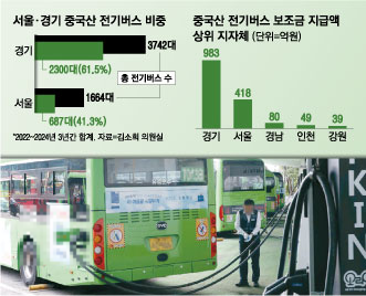 특히 인천시는 78억9800만원의 전기버스 보조금 가운데 49억9600만원(63.3%)을 중국산 전기버스 도입에 사용했으며 경기도 역시 총 1913억6800만원의 전기버스 보조금 가운데 51.4%인 983억9100만원을 중국산에 지원했다.