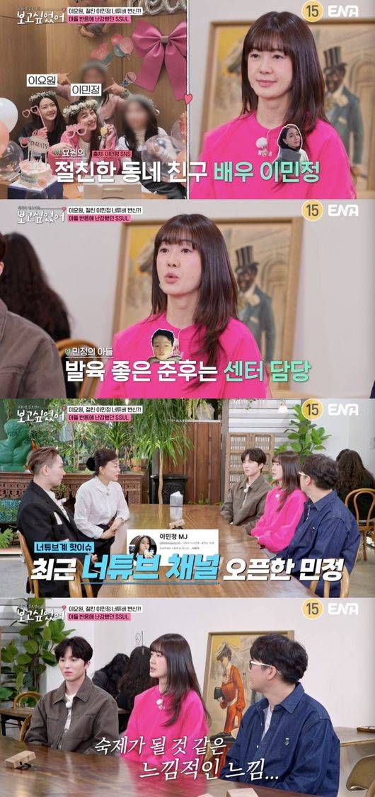 이요원은 “(이민정 아들)준후가 훨씬 키가 크고 해서 센터를 하고 저희 아들은 평균 키다. 빠르고 해서 가드를 담당하고 있다. 둘이 어릴 때부터 친구니까 호흡은 잘 맞는다”라고 전했다. 이어 그는 “얼마 전에 이민정이 유튜브 오픈을 해서 난리가 났다. 아이들 사이에서 ‘조회수가 많이 나온다’, ‘이모도 해요’, ‘엄마도 해요’ 하더라”라고 털어놨다.