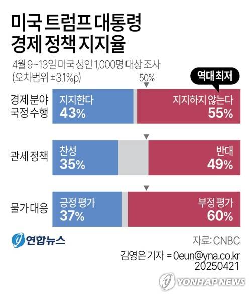 미 CNBC 방송이 지난 9∼13일 미국인 1천명을 상대로 조사해 이날 공개한 결과(오차범위 ±3.1%포인트)에 따르면 트럼프 대통령의 경제 분야 국정 수행을 '지지한다'는 응답은 43%로, '지지하지 않는다'는 응답 55%에 못 미쳤다.