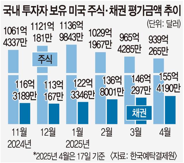 반면 채권 평가액은 늘고 있다. 17일 기준 국내 투자자들이 보유한 미국 채권 평가액은 155억4190만 달러(약 22조1000억원)로 지난해 말(113억167만 달러) 대비 37.51% 늘었다. 통상 증시가 하락하면 채권 가격이 오르지만(국채 금리 하락) 이례적으로 트럼프 행정부의 신뢰도 저하로 채권 가격이 하락(금리 상승) 중이다. 그런데도 채권 평가액이 증가한 이유는 투자자들이 미 국채를 중심으로 꾸준히 채권을 사들이고 있는 데다 가격 하락 폭이 증시만큼 가파르지 않아서다.