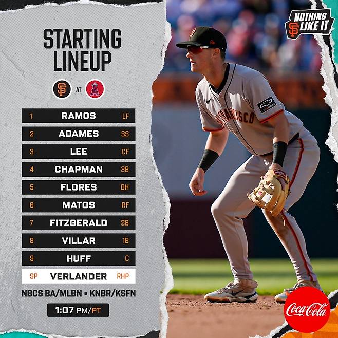 샌프란시스코는 21일(이하 한국시간) 미국 캘리포니아주 애너하임의 에인절 스타디움에서 열릴 2025 메이저리그(MLB) 정규시즌 LA 에인절스와 원정 경기를 앞두고 선발 라인업을 발표했다.