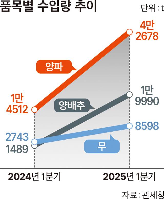 ◆ “값 저렴하고 구하기도 쉬워”…외국산 소비 고착화되면 국내 생산위축 명약관화=이같은 업계 동향은 수입량에서도 그대로 드러난다. 관세청에 따르면 올들어 3월까지 외국산 양배추는 1만9990t이 수입됐다. 지난해 같은 기간(1489t)과 견줘 13배 폭증했다. 같은 기간 무는 8598t, 양파는 4만2678t이 수입됐다. 각각 전년 동기보다 213.5%, 194.1% 늘었다. 이들 품목은 식자재업체가 특히 많이 쓰는 채소라는 공통점이 있다.