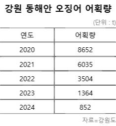 그런데도 어업인의 신청이 증가하는 건 오징어 어획량이 늘어날 기미가 보이지 않아서다. 강원도 글로벌본부의 주간어획 동향에 따르면 지난해 강원 동해안에서 잡힌 오징어는 852t에 불과하다. 2020년 8652t이 잡힌 것과 비교하면 10분의 1 수준이다. 2021년엔 6035t, 2022년 3504t, 2023년 1365t이 잡히는 등 매년 감소 추세다.