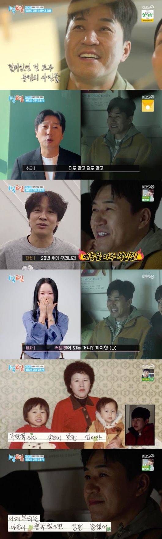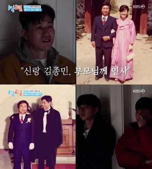 김종민은 ‘1박 2일’을 함께 했던 멤버들의 진심 어린 축하를 받았다. 영상편지를 통해 먼저 이수근은 “너무나 사랑하는 우리 종민이 결혼 정말 축하하고, '더도 말고 덜도 말고 수근이 형처럼 살아라' 한 마디 해주고 싶다. 늘 아내 존중해주고 아내에게 존중받을 수 있는 남편이 되길 바란다. 예쁜 조카 태명 ‘일박이’로 짓는 거 어떨까 생각해"라고 축하와 결혼 선배로서의 조언을 전했다.