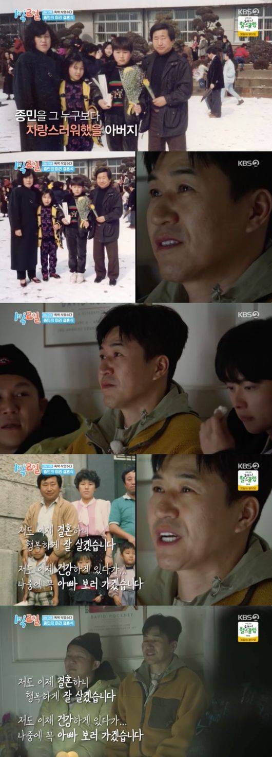 [OSEN=선미경 기자] 그룹 코요태 멤버 김종민이 너무 일찍 세상을 떠난 아버지와 결혼식을 함께하지 못하는 것에 눈물을 흘렸다. ‘1박 2일’ 제작진은 그런 김종민을 위해 아버지와의 추억을 새롭게 만들어주면서 감동을 선사했다.