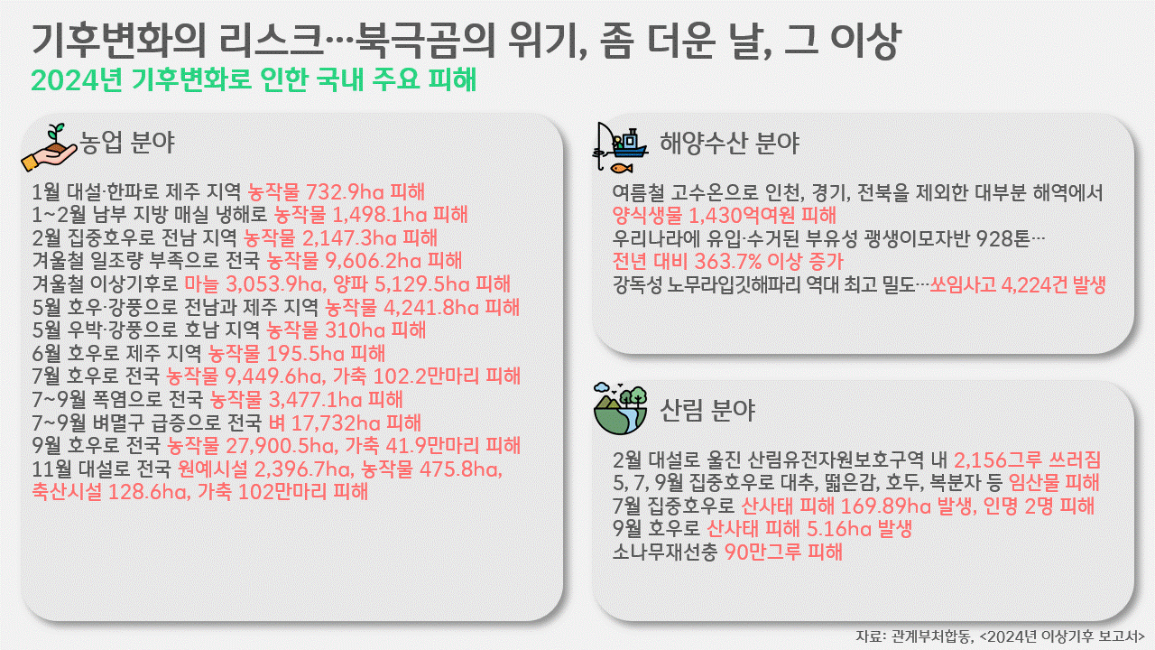 이런 생각과 달리, 우리는 이미 기후변화로 인한 직접적인 피해를 상당히 겪고 있습니다. 기후변화 리스크는 단순히 “한국 역대 최고기온이 기록됐다”는, 기상기록의 경신 그 이상인 겁니다. 이달 초, 정부가 발표한 〈2024년 이상기후 보고서〉엔 기후변화에 따른 각 분야별 영향이 담겼습니다. 농업 분야의 경우, 한파나 호우, 병해충, 대설 등으로 농작물 86,000ha 이상, 가축 246만마리 이상이 피해를 입었습니다. 해양수산 분야에서도 고수온 현상으로 양식생물 총 6,758.5만마리가 폐사해 1,430억원 넘는 피해가 집계됐습니다. 산림 분야의 경우, 대설이나 집중호우로 임산물의 피해가 발생하고, 175ha에 걸친 산사태로 2명의 인명피해 또한 기록됐습니다.