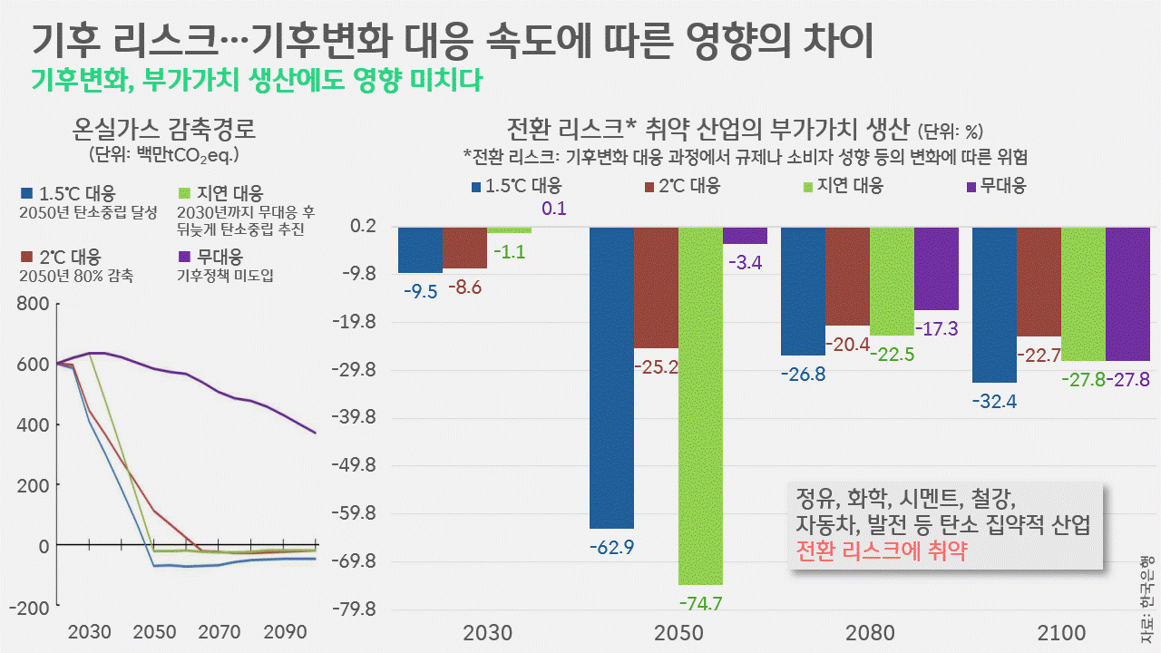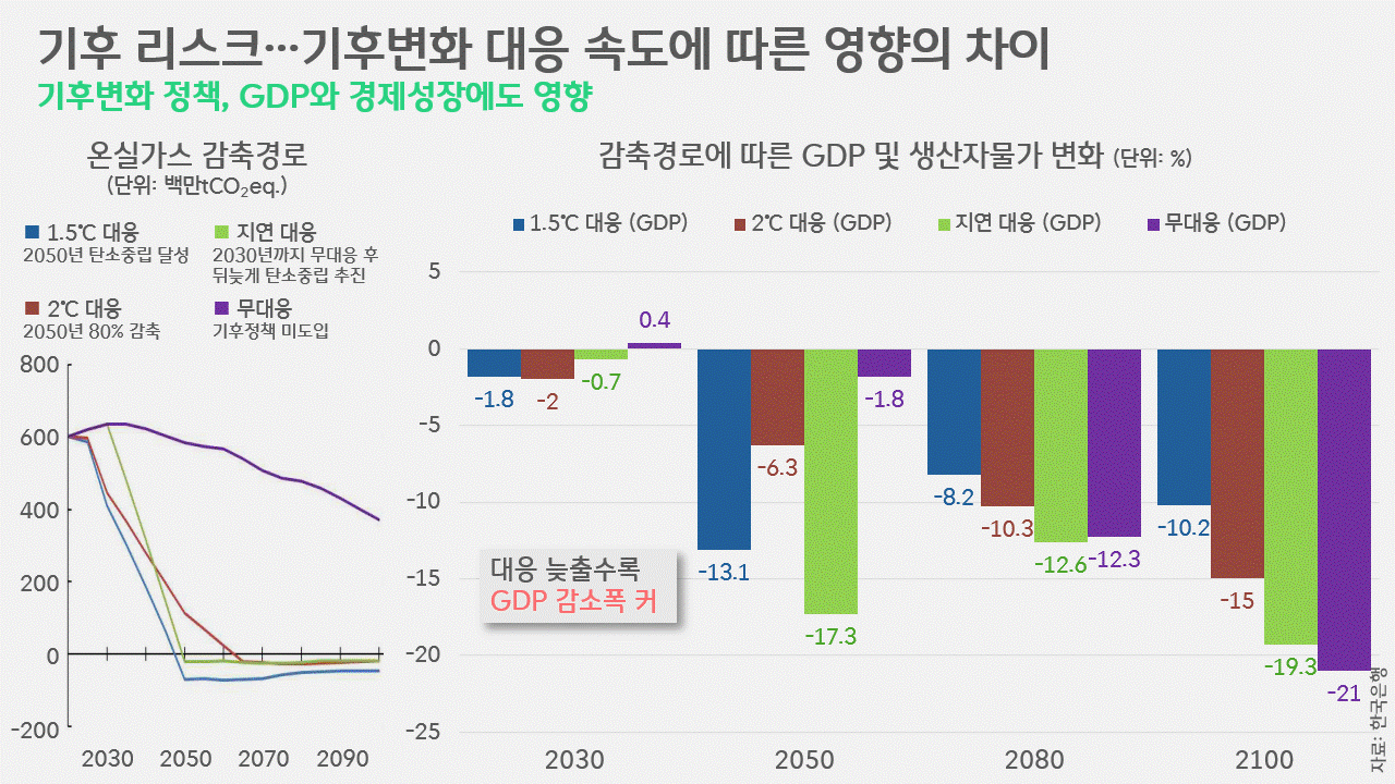 이는 결국, GDP 성장률에 직접적인 영향을 미치게 됩니다. 한은은 감축경로에 따른 경제성장률의 변화를 예측한 결과, 미래 후반기(2081~2100년) 경제 성장률은 기준 시나리오 대비 1.5℃ 대응 시 –0.11%p. 감소에 그치는 반면, 2℃ 대응 시 –0.27%p., 지연 대응 시 –0.41%p., 무대응 시 –0.52%p로 악영향이 더욱 커지는 것으로 내다봤습니다.