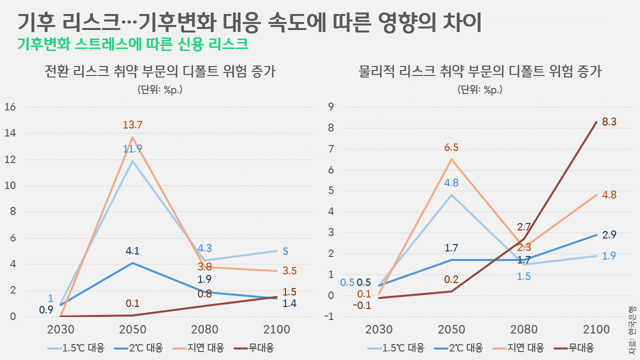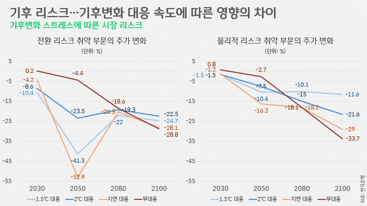 이런 피해는 하나하나 모여 국가의 사회경제적 피해로 이어지게 됩니다. 그 영향과 피해가 앞으로 어떻게 되느냐는 것은 우리에게 달려있습니다. 우리의 행동과 정책에 따라 천차만별로 달라지게 되는 겁니다. 한국은행은 최근 〈은행·보험사에 대한 하향식 기후변화 스트레스 테스트 결과〉를 통해 기후변화에 대응하기 위한 온실가스 감축 정책이 갖는 사회경제적 영향에 대해 정량적으로 평가한 결과를 공개했습니다. 한국은행은 크게 4가지 시나리오에 따른 앞으로의 결과를 살펴봤습니다. ① 2050년 탄소중립 달성을 위해 신속한 감축에 나서는 1.5℃ 대응, ② 2050년 탄소중립까지는 아니더라도 지금보다 온실가스를 80% 줄이고, 2060년 이후에야 탄소중립에 이르는 2℃ 대응, ③ 2050년 2℃ 수준의 소중립을 달성하긴 하지만, 2030년까진 아무 대응을 하지 않다 뒤늦게 급격한 감축에 나서는 지연 대응, 그리고 ④ 아무런 기후 정책을 도입하지 않는 무대응 시나리오가 바로 그것입니다. 그리고, 각 시나리오별 기후 리스크를 평가했는데, 이 리스크는 크게 물리적 리스크와 전환 리스크로 구분됐습니다.