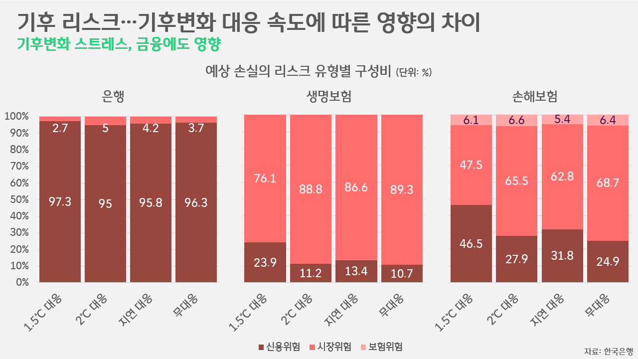 한편, 한은은 〈은행·보험사에 대한 하향식 기후변화 스트레스 테스트〉라는 이름에서 볼 수 있듯, 지금까지의 전망 결과를 종합해 금융 시장이 겪게 될 영향도 산출했습니다. 테스트 대상 금융기관은 은행과 생명보험, 손해보험으로 구분해 분석했는데, 대출의 비중이 높아 신용위험에 취약한 것으로, 보험사는 주식과 채권의 비중이 높아 시장위험에 취약한 것으로 봤습니다. 이들 기관의 업종별 익스포저도 분석했는데, '전환 리스크'에 취약한 제조업 익스포저의 경우, 손해보험(21.8%), 은행(22.6%), 생명보험(39%) 순으로 높은 것으로 나타났습니다. '물리적 리스크'에 취약한 업종에 대한 익스포저는 생명보험(14.2%), 은행(22.8%), 손해보험(26%) 순으로 나타났습니다. 때문에 향후 기후변화 대응에 따른 손실에 있어 기관별 주요 리스크도 달랐습니다. 은행의 경우, 신용위험에 따른 리스크가 대부분을 차지했고, 생명보험은 시장위험에 따른 리스크가 대부분이었습니다. 손해보험의 경우엔 신용위험과 시장위험의 비중이 상대적으로 비슷했습니다.