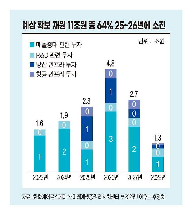 한화에어로스페이스는 지난해 영업이익 1조7000억원을 올렸다. 올해 영업이익은 2조5000억원에 이를 것으로 전망된다. 영업이익 규모가 사상 최대 수준이지만 계획한 투자 규모는 이를 능가한다. 앞서 한화에어로스페이스는 11조원 투자 계획을 발표했다. 유상증자로 조달하는 3조6000억원을 제외한 나머지 7조4000억원은 향후 벌어들일 현금과 금융회사 차입 등을 통해 마련한다. 한화의 핵심 무대인 유럽에서 최근 역내 생산된 무기를 구매하자는 방산 블록화 열풍이 거세지고 있는 만큼 초격차 기술로 수주전에 나서야 승산이 있다고 본 것이다. 미국, 유럽 등 선진국 방산업체의 견제가 심해지고 있다는 점도 투자를 서두른 배경으로 꼽힌다. 한화 관계자는 “투자 타이밍을 놓치면 지금 같은 방산 호황이 물거품이 될 수 있다는 우려에 따라 11조원의 투자금을 확보하기로 했다”고 설명했다