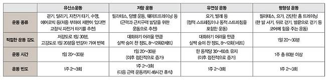 4050세대를 위한 운동 프로그램을 아래의 표와 같이 제안하지만 4050세대는 다양한 질환이 발생할 가능성이 있으므로 운동이 처음이라면 보수적으로 시작할 것을 권한다. 내가 할 수 있는 목표의 70~80% 수준으로 강도를 정해 먼저 시작해보고, 점진적으로 늘려나가는 것을 추천한다.