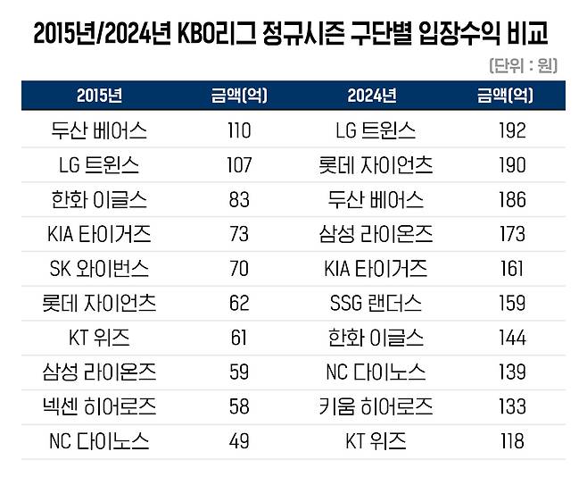 2015년 가장 높은 입장수익을 올린 두산 베어스의 매출이 110억 원 정도였는데, 지난해 입장 수익 최하위인 KT 위즈의 매출이 118억 원에 달했습니다. 그야말로 상전벽해입니다.