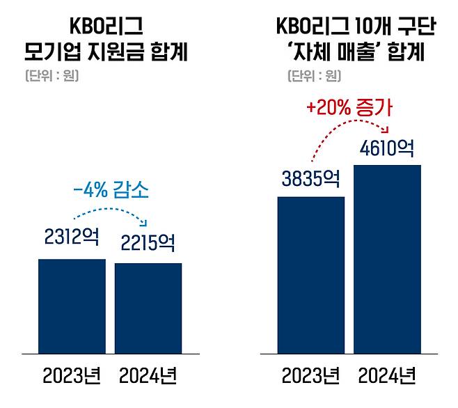 이런 매출 성장세가 놀라운 건, 야구단 수입의 상당수를 차지하는 모기업의 지원금이 2023년에 비해 오히려 줄어든 상황이기 때문입니다. 2023년 2,312억 원에 달했던 9개 구단의 모기업 지원금 총액은 지난해 2,215억 원으로 4% 줄었습니다. 하지만 전체 매출에서 모기업 지원금을 뺀 금액, 이른바 구단의 '자체 매출'은 2023년 3,835억 원에서 지난해 4,610억 원으로 20% 증가했습니다.