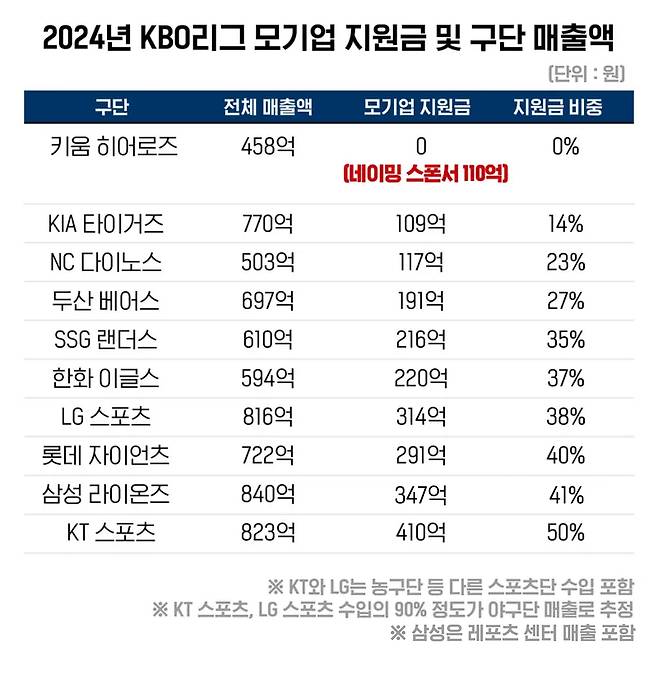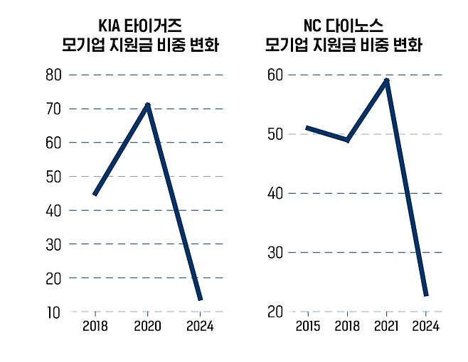 야구의 인기가 올라가고, 프로야구에 돈이 몰리면서 야구단의 모기업 지원금 비중은 갈수록 줄어드는 추세가 확인됐습니다. 코로나19 대유행 시기 수익성이 악화하면서 전체 매출의 71%를 모기업 지원금으로 버텨내야 했던 KIA 타이거즈는 올해 모기업 지원금 비율을 14%까지 극적으로 낮췄고, 창단 이후 내내 40~50%대의 모기업 지원금 비중을 기록했던 NC 다이노스도 지난해 그 비율을 23%로 떨어뜨렸습니다. 두 구단의 모기업 지원금은 히어로즈가 키움 증권과 맺은 네이밍 스폰서십 비용, 1년에 110억 원과 비슷한 정도의 수준입니다.