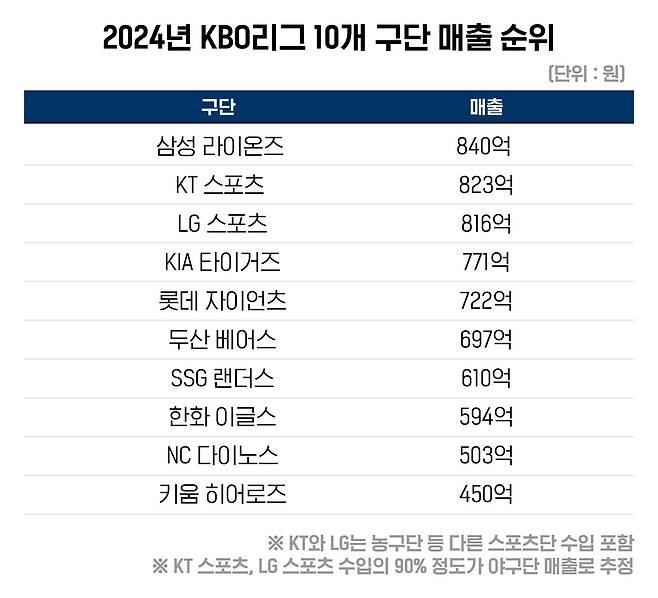 '자체 매출' 1년 만에 20% 증가 지난해 10개 구단의 매출 총합계는 6,825억 원이었습니다. 2023년 6,147억 원을 기록한 것에 비해 1년 만에 11% 증가했고, 코로나 직전인 2019년에 비해서도 32%가 올랐습니다. 지난해 준우승 팀 삼성 라이온즈가 840억 원의 매출을 올려 1위에 올랐고, 가장 낮은 매출을 기록한 구단은 450억 원의 키움 히어로즈였습니다.