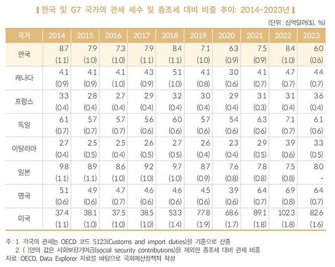 한국의 총조세 대비 관세 비중은 2023년 기준 0.6% 수준으로 독일(0.6%), 영국·캐나다(0.7%) 등 주요 7개국(G7)과 비슷한 수준입니다.