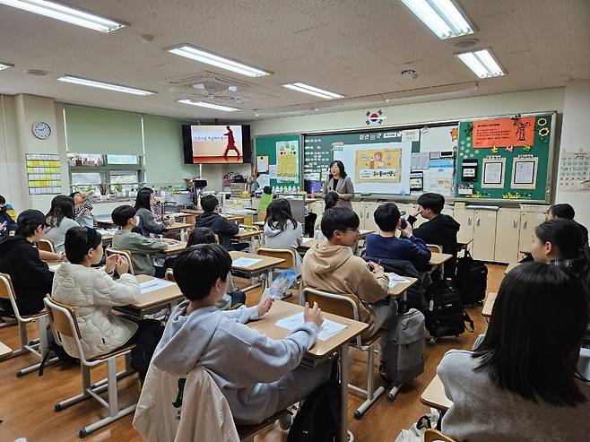 | ▲ 교육자원봉사 강의 모습 '이들에게 부응하기 위해 한껏 흥을 끌어올려 강의한다. |