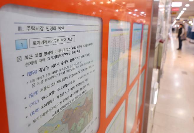 [정부와 서울시가 강남 3구와 용산구 아파트 전체를 토지거래허가구역으로 지정한지 일주일째인 30일 서울 송파구 잠실 한 부동산 중개업소에 주택시장 안정화 방안 브리핑 자료가 붙어있다. (사진=연합뉴스)]'
