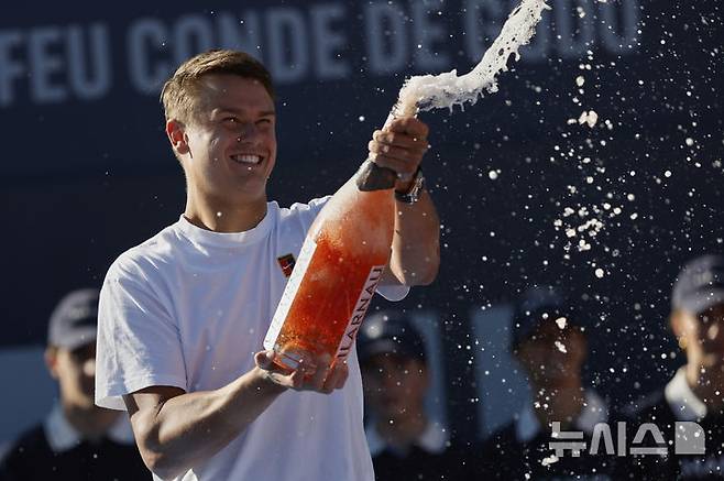[바르셀로나=AP/뉴시스] 홀게르 루네(13위·덴마크)가 20일(현지 시간) 스페인 바르셀로나에서 열린 남자프로테니스(ATP) 투어 바르셀로나 오픈(ATP500) 정상에 올라 샴페인을 터트리고 있다. 루네는 결승전에서 카를로스 알카라스(2위·스페인)를 2-0(7-6 6-2)으로 꺾고 우승컵을 들어 올렸다. 2025.04.21.