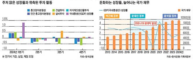 이는 2023년 정부의 R&D 예산 삭감, 반도체 업황 악화로 인한 대기업 적자, 석유화학· 배터리 등 주력 산업 부진, 프로젝트파이낸싱(PF) 구조조정에 따른 건설업 침체 등으로 민간투자 활동이 동시에 위축된 결과다. 그럼에도 윤석열 정부는 ‘건전재정’ 기조를 고수하며 예산 총지출 증가율을 3년 연속 줄였고, 이에 따라 경기 침체를 사실상 방관했다는 평가가 나온다. 장민 한국금융연구원 선임연구위원은 “윤석열 정부의 경직적인 재정 운용이 민간 경제의 활력을 살릴 여력을 제약했고, 경기 침체 국면에서 적극적인 정책 대응을 가로막는 결과를 낳았다”고 지적했다.