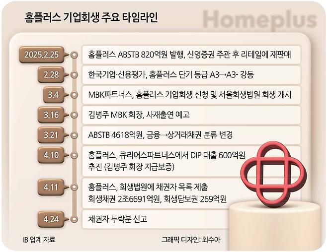 ▶입지 흔들리는 MBK…국내 투자 제동 자체는 불가=현재 MBK와 홈플러스 경영진이 사기 혐의를 받는 지점은 2월25일 자산유동화전자단기사채(ABSTB)를 발행한 일이다. 신용도 강등 공시 2영업일 전이자 기업회생 신청 3영업일 전인 당일 유동화시장에서 820억원어치 ABSTB를 발행해 카드대금과 수수료 등을 카드사에 납부했다. 해당 업무를 주관한 신영증권은 회생 신청 직전 채권 발행은 사기성이 짙다고 보고 홈플러스를 고소한 상태다.