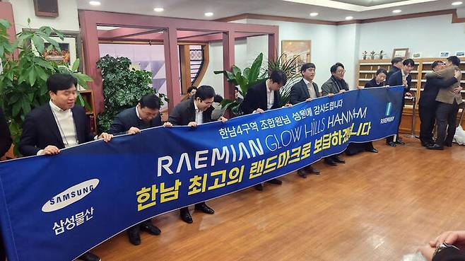 ▲ 지난 1월 18일 서울 용산구 이태원동의 한 교회에서 진행된 한남4구역 재개발정비사업 조합원 총회 결과 삼성물산이 시공사로 선정되자 삼성물산 관계자들이 감사 인사를 하고 있다.