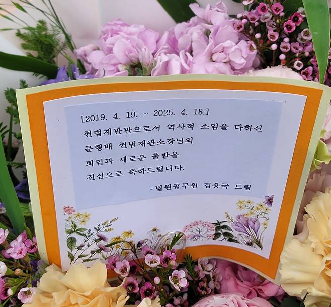 | ▲ 퇴임 축하 꽃다발 퇴임축하 꽃다발. 카드에는 다음과 같이 적혀 있다. "헌법재판관으로서 역사적 소임을 다하신 문형배 헌법재판소장님의 퇴임과 새로운 출발을 진심으로 축하드립니다. -법원공무원 김용국" |