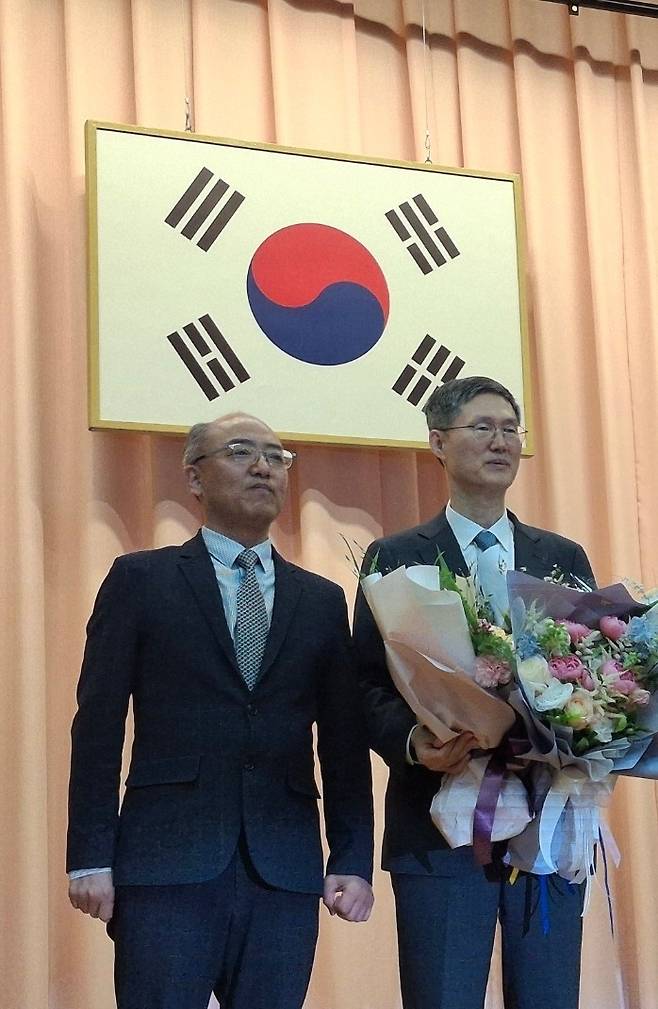 | ▲ 퇴임식장에서 문형배 헌법재판소장 권한대행과 함께 지난 18일 오전 헌법재판소에서 열린 문형배 헌법재판소장 권한소장 퇴임식장에서 함께 기념촬영을 했다. |