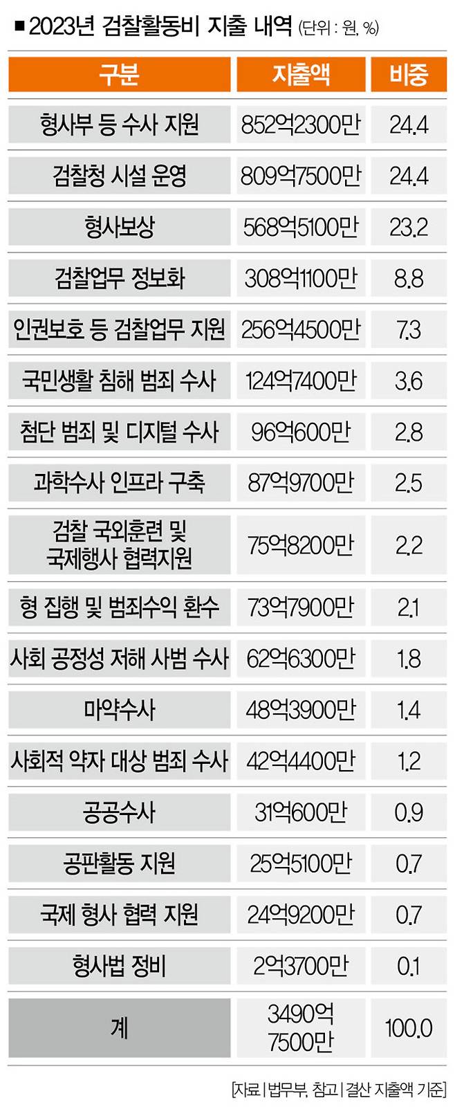 [※참고: 대부분의 검찰활동비가 검사들의 역할과는 다소 무관해 보이는 사업에 쓰이는 것 같지만, 그렇지는 않다. 2023년 국가공무원 인사통계에 따르면 대검찰청 인원은 총 1만880명이었고, 이 가운데 검사(특정직 공무원)는 2023명이 전부다. 행정 관련 예산이 수사 예산보다 많은 건 당연하다.]