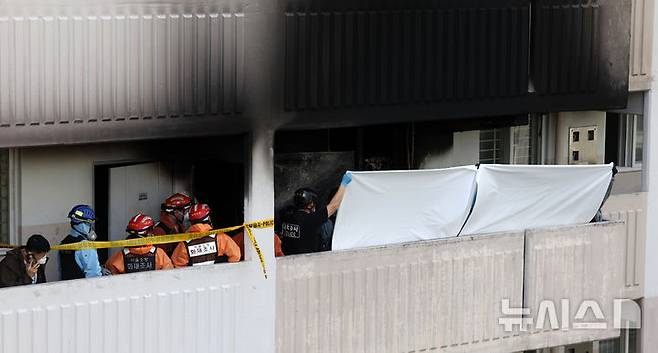 [서울=뉴시스] 홍효식 기자 = 21일 오전 서울 관악구 봉천동의 한 아파트에서 화재가 발생해 소방대원 및 과학수사대가 시신을 수습하고 있다. 2025.04.21. yesphoto@newsis.com