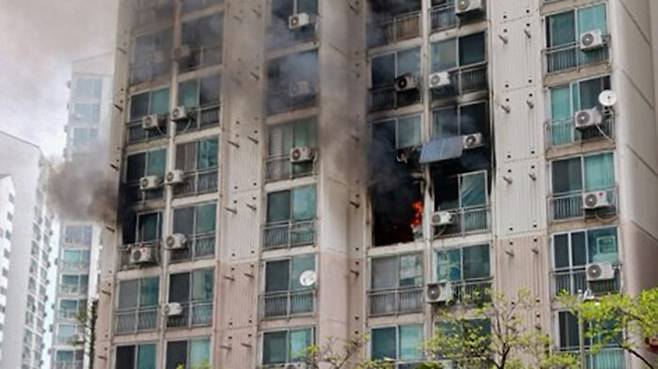 ▲ 21일 서울 관악구 봉천동 한 아파트에서 화재가 발생해 불길과 함께 연기가 피어오르고 있다.