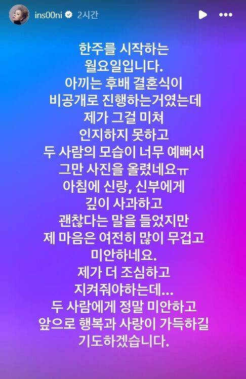 인순이는 21일 자신의 SNS에 "아끼는 후배 결혼식이 비공개로 진행하는 거였는데 제가 그걸 미처 인지하지 못하고 두 사람의 모습이 너무 예뻐서 그만 사진을 올렸네요"라는 글을 올려 자신의 실수를 인정했다.