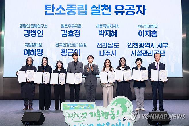 (서울=연합뉴스) 김완섭 환경부 장관이 21일 서울 강서구 코엑스마곡에서 열린 2025년 기후변화주간 개막식에서 탄소중립 실천 유공자들과 기념 촬영하고 있다. 2025.4.21 [환경부 제공. 재판매 및 DB 금지]