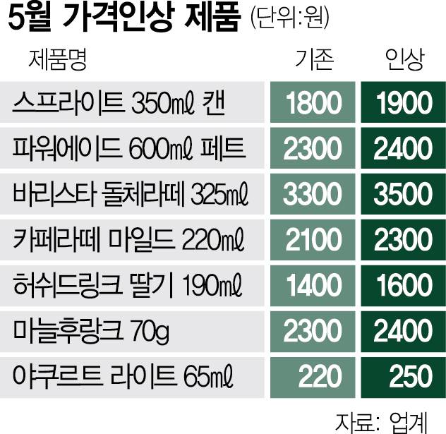 가격인상 아직 안끝났다···커피·스프라이트 5월부터 오른다