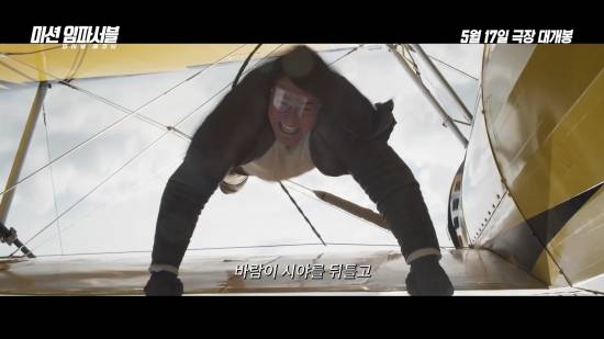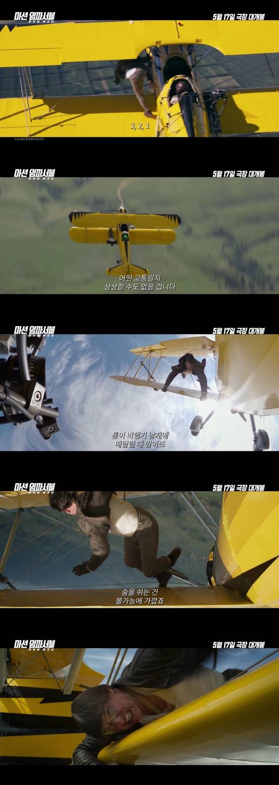 이번 영상은 앞서 공개된 예고편 속 명장면으로 뜨거운 화제를 불러일으킨 고공 회전 비행기에 매달리는 액션 스턴트의 생생한 현장을 포착했다. 무려 2,438미터(8,000피트) 상공에서 시속 225km의 거센 바람 속 비행기의 한쪽 날개에 위태롭게 매달린 톰 크루즈의 모습은 보는 이마저 손에 땀을 쥐게 하는 경탄을 자아낸다. 엄청난 바람으로 인해 시야가 왜곡되고 정상적으로 호흡하는 것조차 불가능한 극한의 상황 속에서도 CG 없이 직접 촬영에 임하는 톰 크루즈의 모습은 작품을 향한 놀라운 열정을 가늠케 한다.