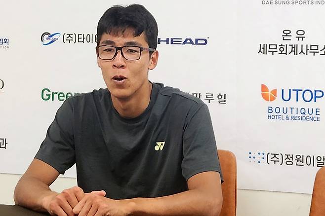 정현이 2025 광주오픈 챌린저 단식 2라운드에 안착한 뒤 프레스룸 인터뷰에서 환하게 웃으며 질문에 답하고 있다.