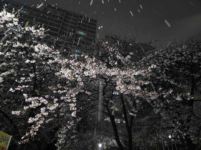 벚꽃이 만개한 4월의 밤, 이례적으로 눈이 내렸다.
