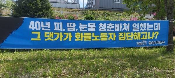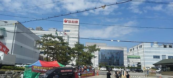 | ▲ 오리온제과 청주공장 앞에 내걸린 현수막. |