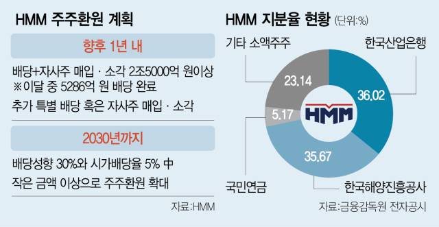 21일 투자은행(IB) 업계에 따르면 HMM은 이르면 상반기 내 자사주 매입을 실시하기로 하고 KB증권과 전략 마련에 돌입했다. HMM은 올 초 기업가치 제고 계획을 공시하면서 1년 내 2조 5000억 원 이상의 주주환원 프로그램을 가동하겠다고 발표했다. 이달 중 총 5286억 원의 배당금 지급이 완료될 예정인 가운데 나머지 재원 중 최대 2조 원은 자사주 매입에 쓸 것으로 관측된다.