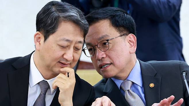 ▲ 최상목 경제부총리 겸 기획재정부 장관(오른쪽)과 안덕근 산업통상자원부 장관이 21일 정부서울청사에서 열린 경제안보전략 태스크포스(TF) 회의에 참석해 논의하고 있다.