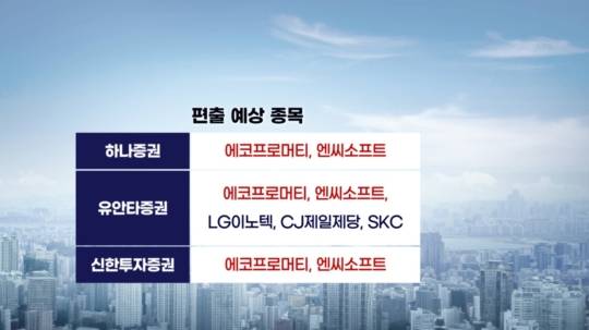 반면 편출 유력 종목으로는 에코프로머티와 엔씨소프트가 꼽히고 LG이노텍, CJ제일제당, SKC 등도 후보군으로 거론됩니다.