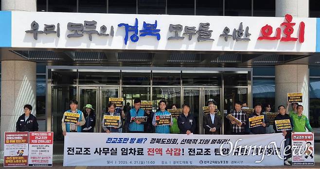 전교조 경북지부는 21일 경북도의회 앞에서 기자회견을 열고 사무실 지원비 전액 삭감을 강력히 규탄했다.