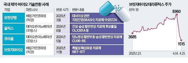국내 바이오기업의 기술수출 무산이 이어지자 업계 전반에 위기감이 고조되고 있다. 브릿지바이오테라퓨틱스는 반환받은 신약 기술의 임상에 실패해 5거래일 연속 하한가를 기록했다. 글로벌 제약사의 투자심리 위축과 전략 변화 속에서 국내 바이오업계가 돌파구를 찾아야 한다는 분석이 나온다.