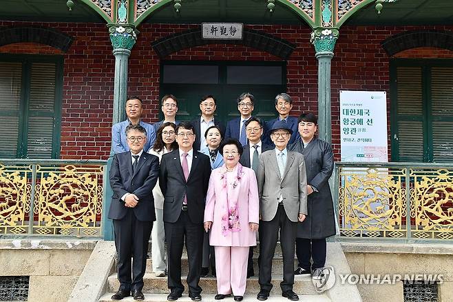 (서울=연합뉴스) 최응천 국가유산청장(앞줄 왼쪽 두 번째)이 21일 서울 중구 덕수궁에서 열린 '대한제국 황궁에 선 양관 - 만나고, 간직하다' 특별전 개막식에서 주요 참석자들과 기념촬영을 하고 있다. 2025.4.21 [국가유산청 제공. 재판매 및 DB 금지]